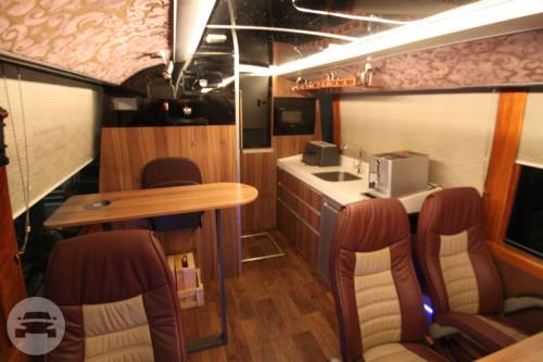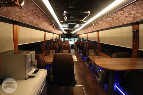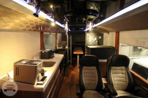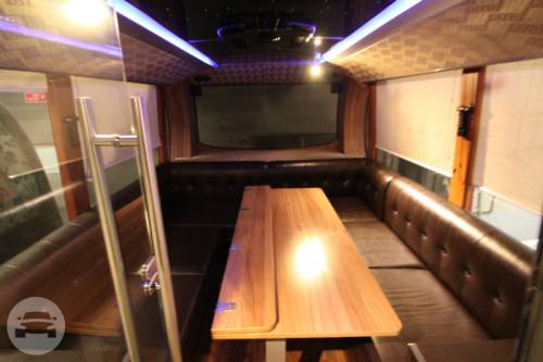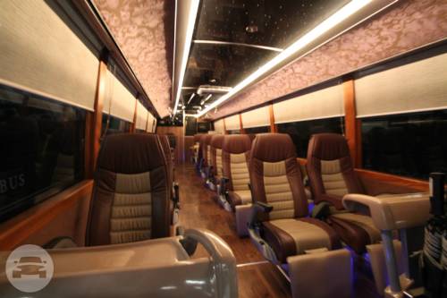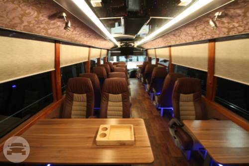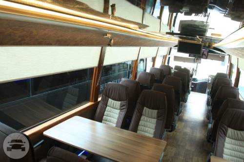 CAPACITY: 21 Persons MODEL: 2014 COLOR: BROWN The Luxury Bus is a premium mode of transportation for people traveling together! Wherever you may wish to go with family and friends, you can expect to get there seated in the lap of luxury, and surrounded by the finest things you can have while in transit! Cozy and casual, the Acogedor is designed to comfortably transport two groups of people, with 13 individual seats and a couch that seats eight, accommodating a total of 21 guests. The Luxury Bus fleet is also equipped for your ultimate safety. It is fitted with a speed limiter, an anti-lock braking system (ABS) and a GPS tracking device. SPECIAL FEATURES: -Glass partition separating the two sections of the bus -Sausage cooker, microwave oven, coffee machine, wine cooler (upon request), fully-stocked mini refrigerator and chest chiller -One television screen per section, which may show two separate videos simultaneously, or linked to play the same movie -Sound Stream entertainment system equipped with subwoofers, amplifiers for best sound quality.